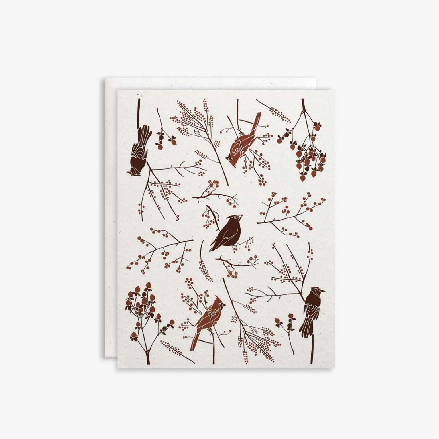 This monochromatic pattern features cardinals, waxwings, and blue jays entangled in winter berries. These cards are printed on 110lb natural white, slightly speckled recycled paper, and paired with matching cream envelopes. All cards are blank inside.