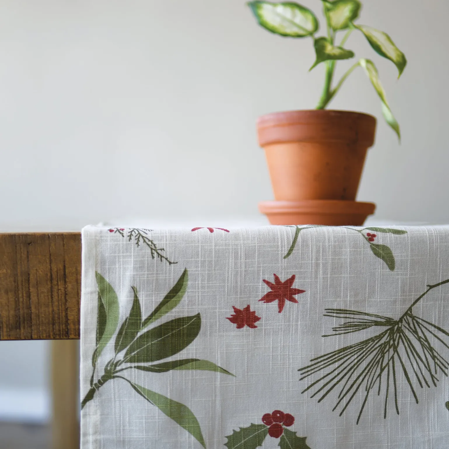 Dress up your table with winter sprigs and berries with this runner. It pairs well with our winter greens napkins and boughs and berries towel.