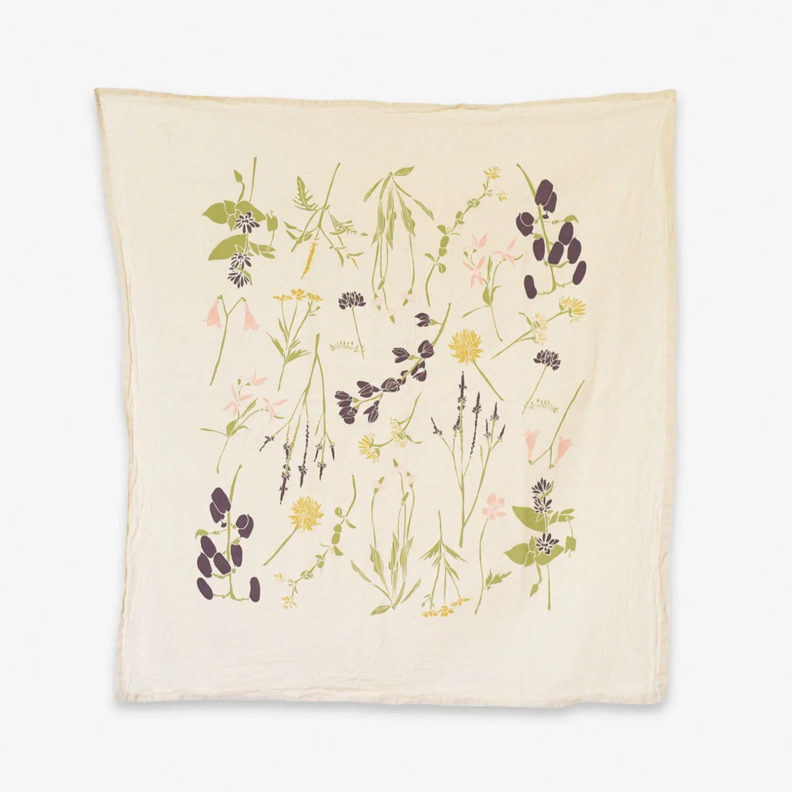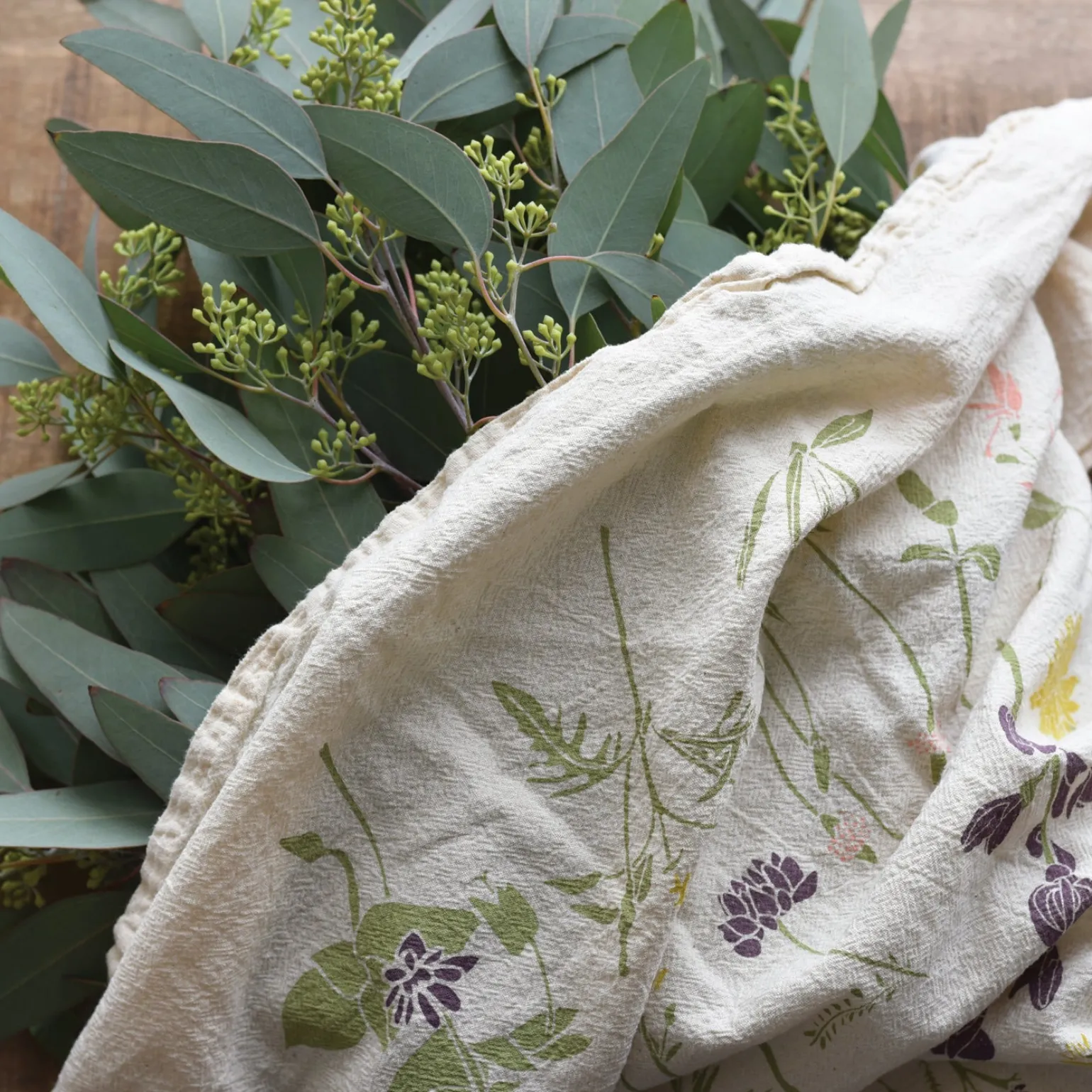 Featuring a pretty pattern of white clover, vervain, ragweed, crown vetch, twinflower creeper, plantains, buttercup, wild indigo, chickweed, bowman’s root and elecampane wildflowers from the eastern United States. Screen printed on natural, unbleached flour sack cotton to preserve its uniquely soft, absorbent, and durable nature, this towel is machine washable, allowing it to hold up for everyday use.