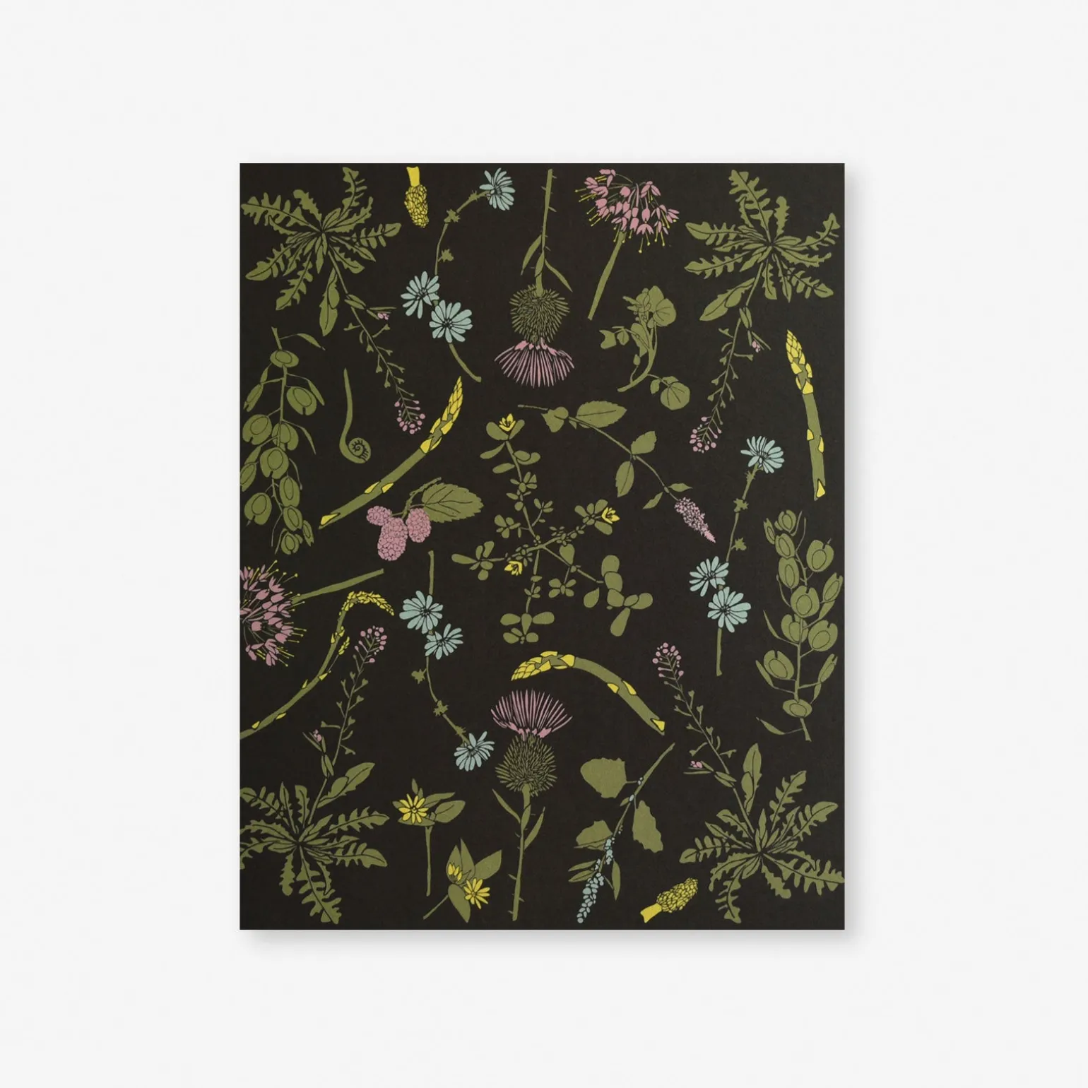 Fiddleheads, morels, bull thistle, and wild asparagus adorn this pattern of edible wilds. Our 8”x10” art prints are printed with soy inks on natural white, slightly speckled, archival paper made from 100% post-consumer waste.
