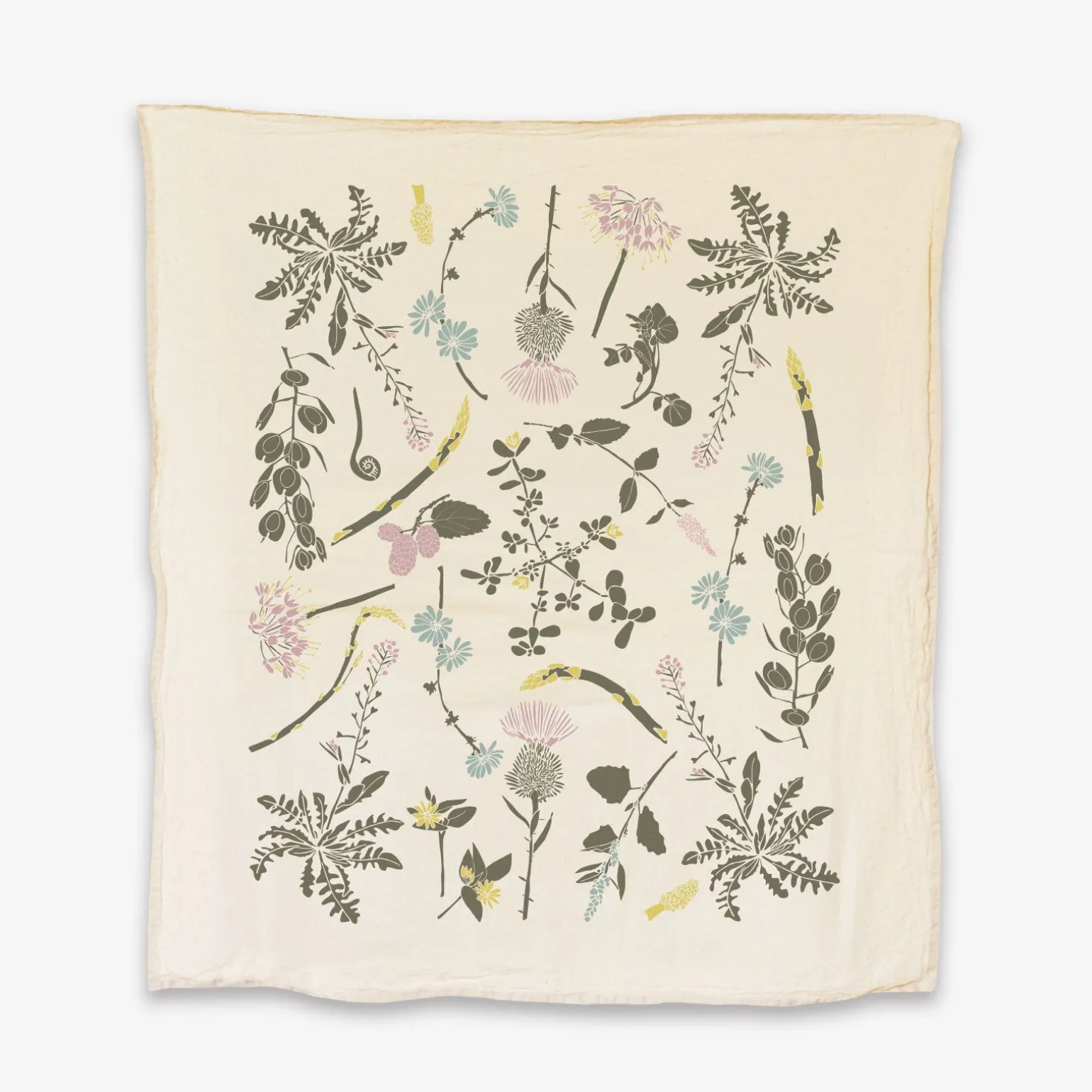 Fiddleheads, morels, bull thistle and wild asparagus adorn this pattern of wild foraged edibles. Screen printed on flour sack cotton to preserve its uniquely soft, absorbent and durable nature, this towel is machine washable and safe to bleach allowing it to hold up for everyday use.