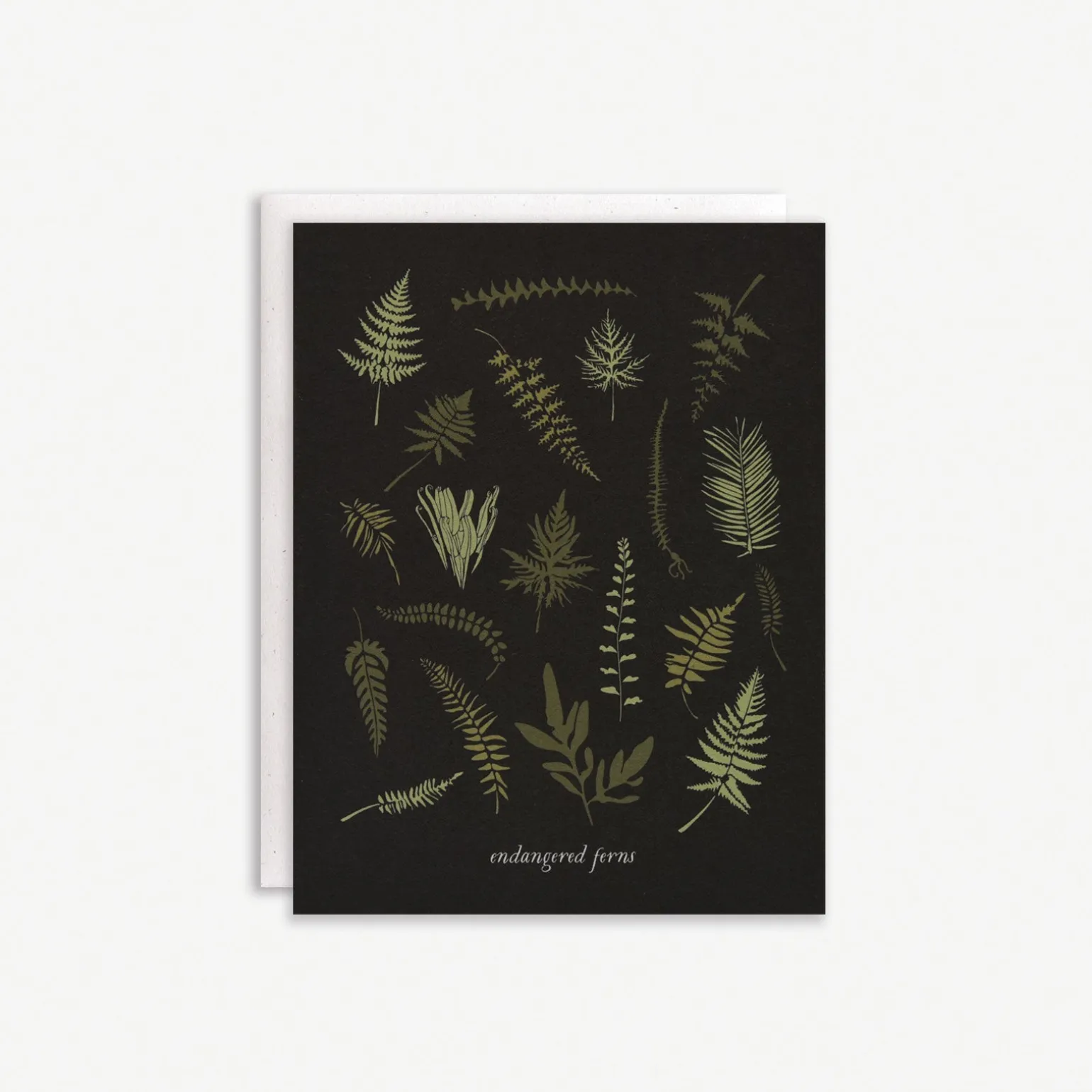 In the United States alone, there are 38 endangered species of ferns. Designed to bring awareness to what we hold sacred, nature and all its wonders. These cards are printed on 110lb natural white, slightly speckled recycled paper, and paired with matching cream envelopes. All cards are blank inside.