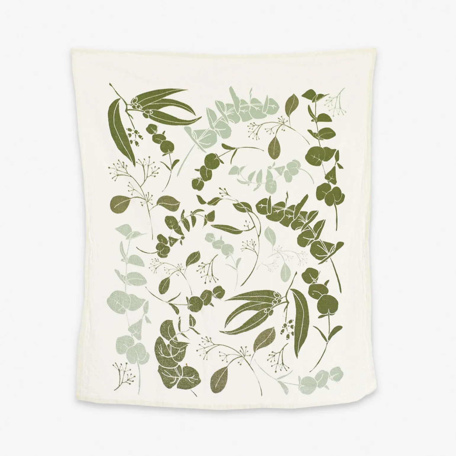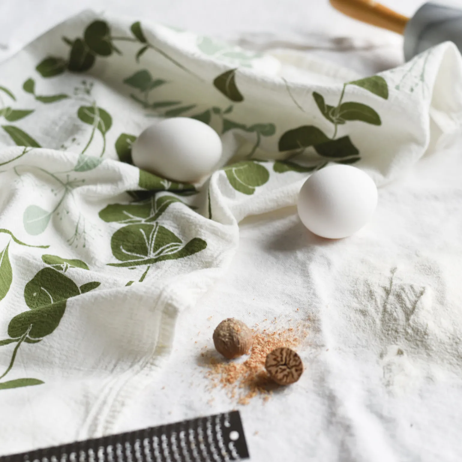 A lovely pattern of silver drop and seeded eucalyptus make this a year round favorite. Screen printed on flour sack cotton to preserve its uniquely soft, absorbent, and durable nature, this towel is machine washable and safe to bleach, allowing it to hold up for everyday use.