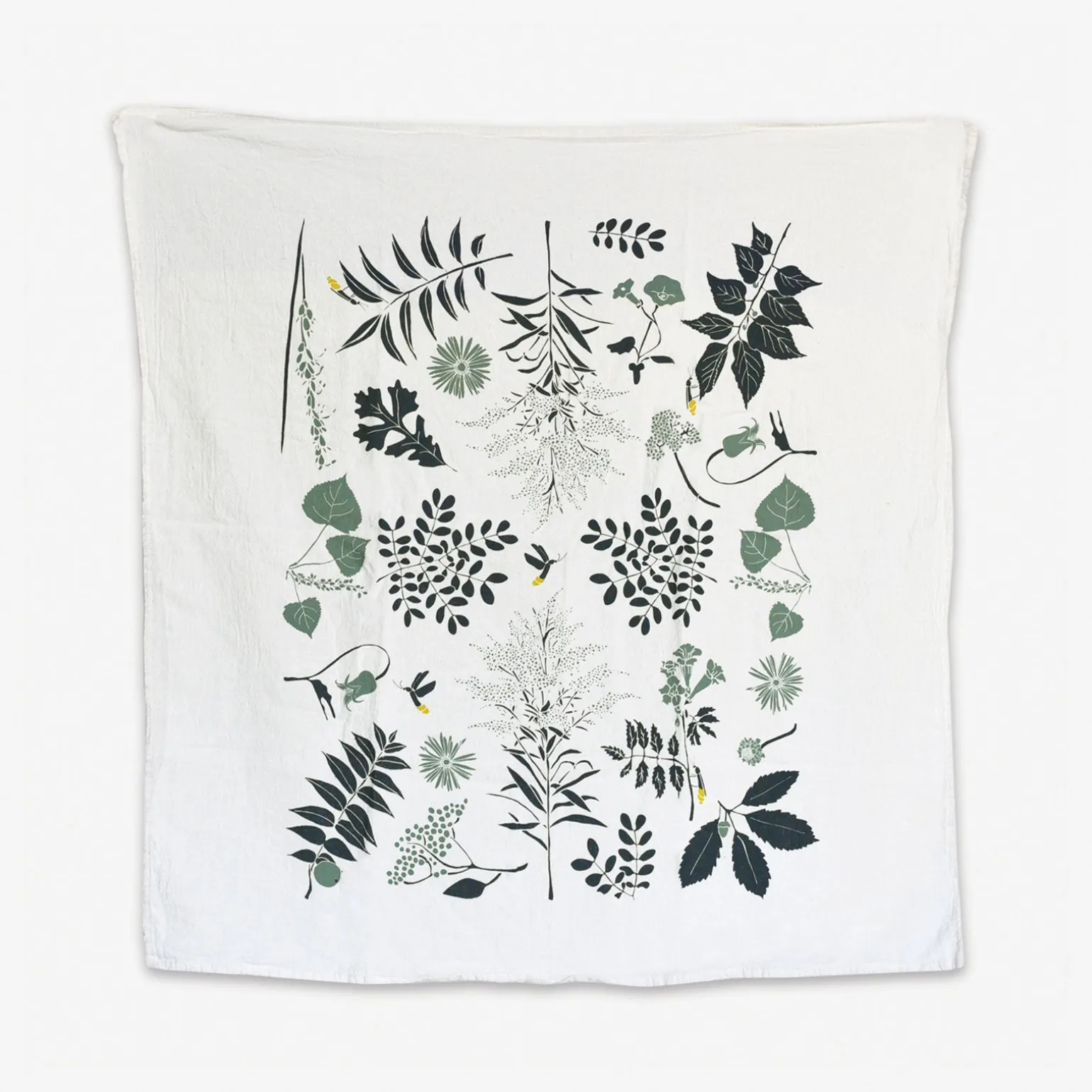 Fireflies, lightning bugs, whichever you prefer, these glow bugs are surrounded by burr oak leaves, goldenrod, cottonwood, and golden ball, the foliage in which they live, where they light up the evening sky. Screen printed on flour sack cotton to preserve its uniquely soft, absorbent, and durable nature, this towel is machine washable and safe to bleach, allowing it to hold up for everyday use.