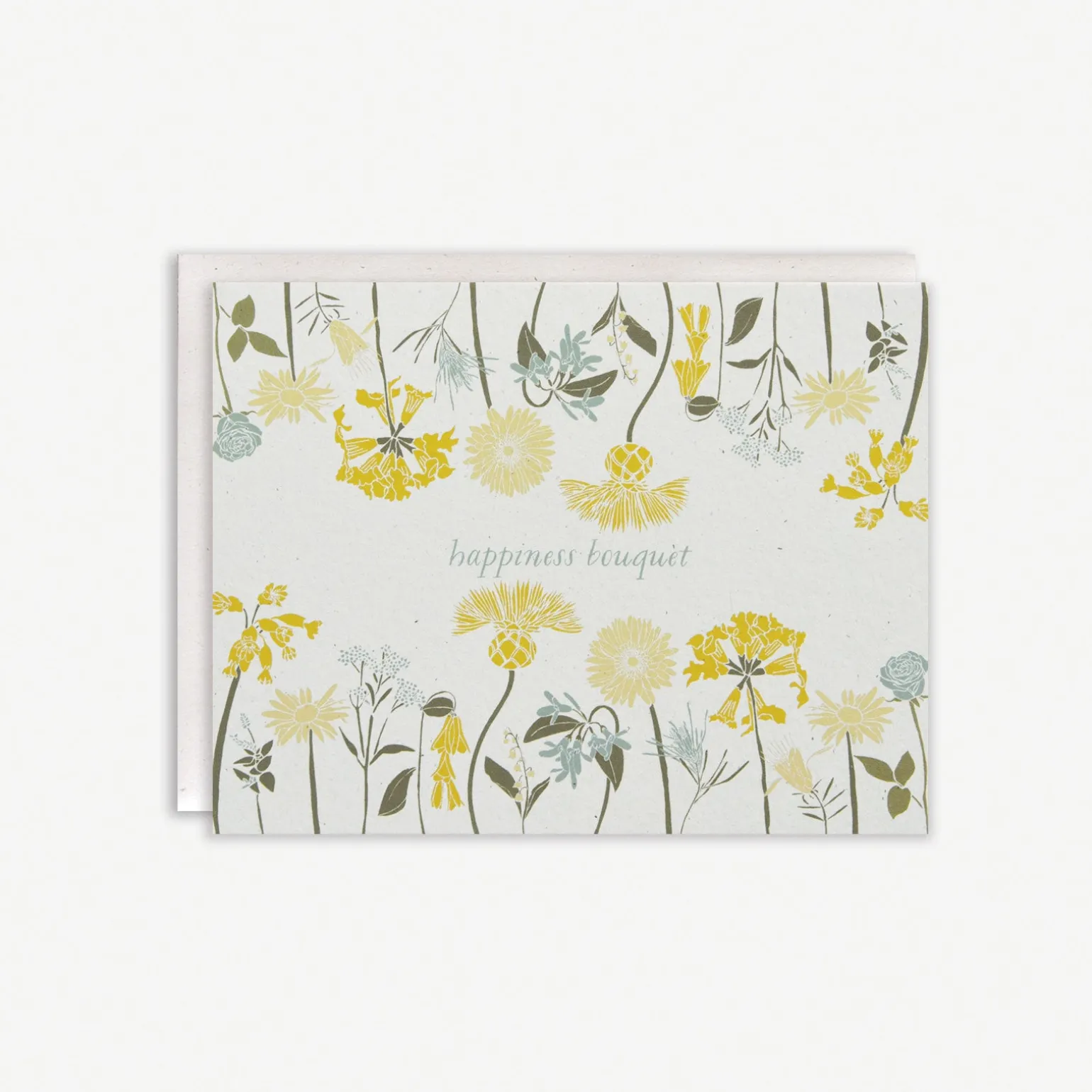 Inspired by the Victorian Era’s beautiful, hidden meanings of flowers that were used to communicate in secret, this card features a bouquet of daisy, golden trumpet, and sweet sultan flowers, to name a few. Each flower symbolizes and embodies the meaning of happiness. Printed on 110lb natural white, slightly speckled recycled paper, and paired with a matching cream envelope. Blank Inside.