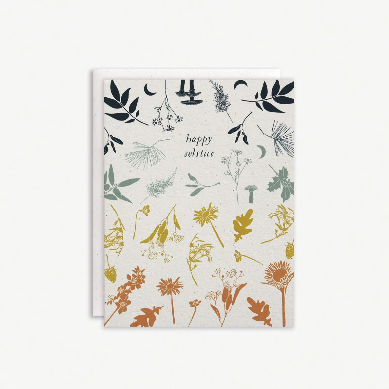 The solstice captures both June & December in our summer + winter solstice card. Designed with the traditional, symbolic botanicals from ancient folklore, this card is printed in the warm and cool colors of each season. Printed on 110lb natural white, slightly speckled recycled paper, and paired with a matching cream envelope. Blank Inside.– A2 size : 4.25” x 5.5”