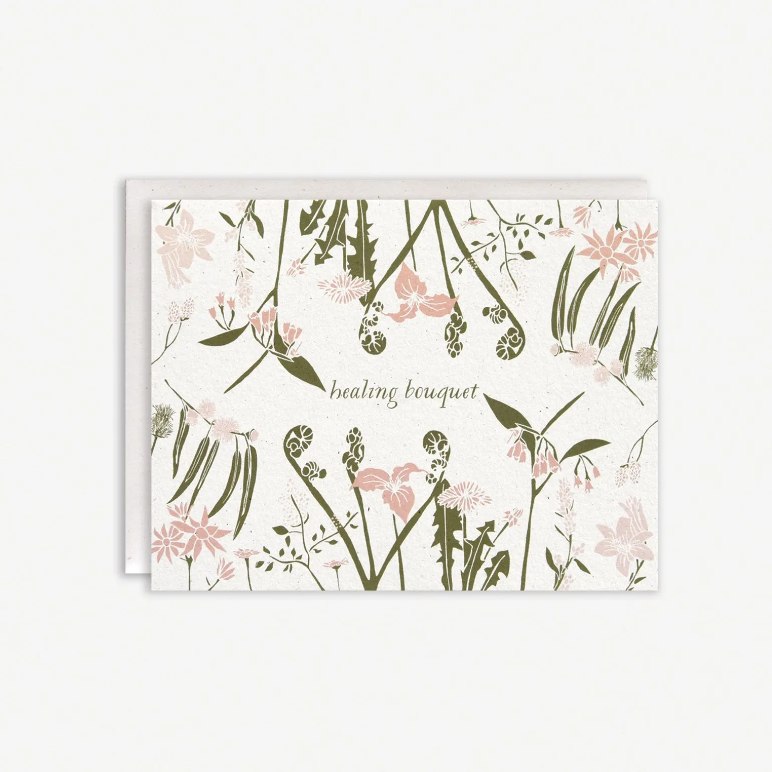 Inspired by the Victorian Era’s beautiful, hidden meanings of flowers that were used to communicate in secret, this card features a bouquet of trillium, burdock, and bracken fern flowers, to name a few. Each flower symbolizes and embodies the meaning of healing. Printed on 110lb natural white, slightly speckled recycled paper, and paired with a matching cream envelope. Blank Inside.