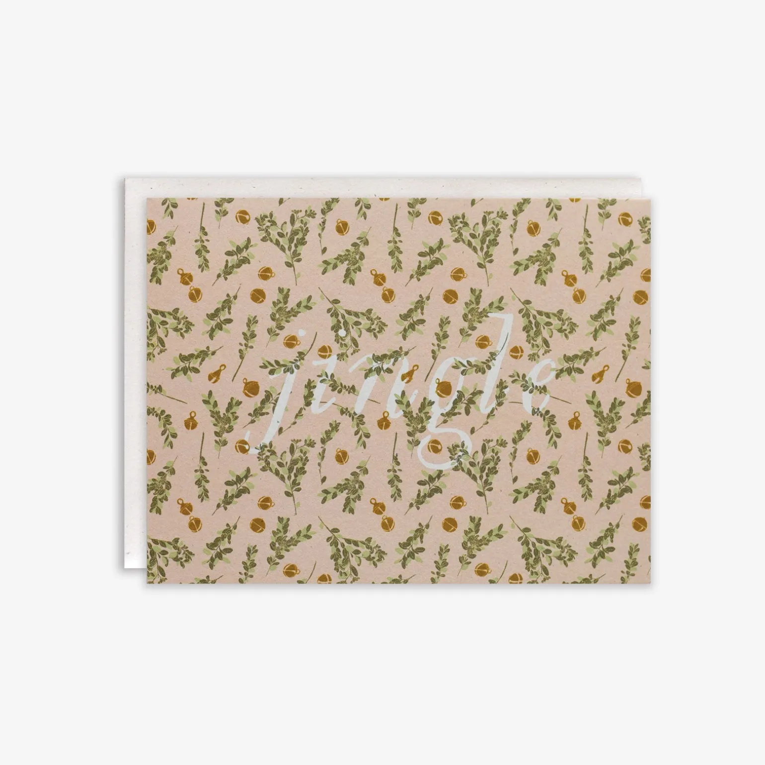 A pretty pattern of boxwood sprigs and vintage bells, our jingle bells card is printed on 110lb natural white, slightly speckled recycled paper, and paired with a matching cream envelope. Blank Inside.