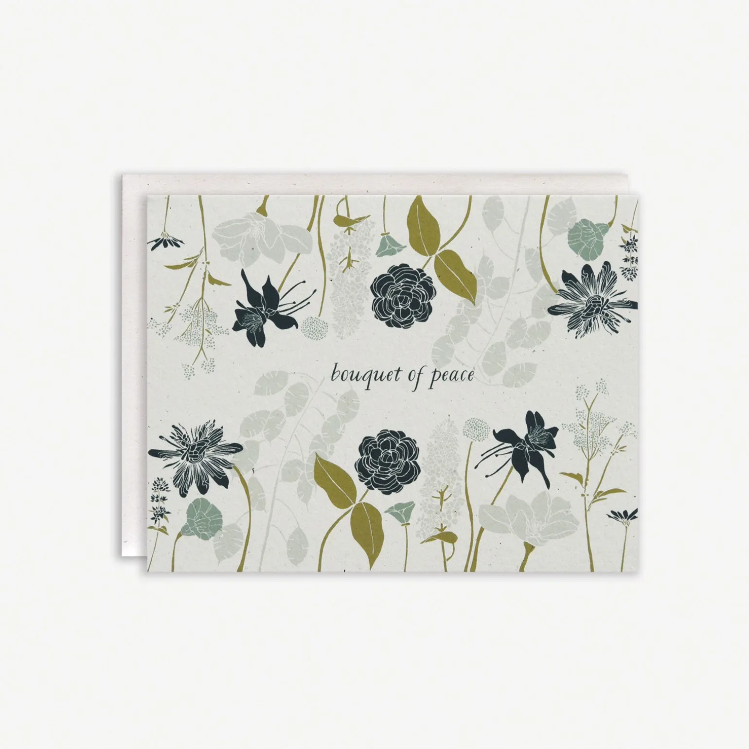 Inspired by the Victorian Era’s beautiful, hidden meanings of flowers that were used to communicate in secret, this card features a bouquet of California poppy, camellia, lilac, and honesty flowers, to name a few. Each flower symbolizes and embodies the meaning of peace. Printed on 110lb natural white, slightly speckled recycled paper, and paired with a matching cream envelope. Blank Inside.