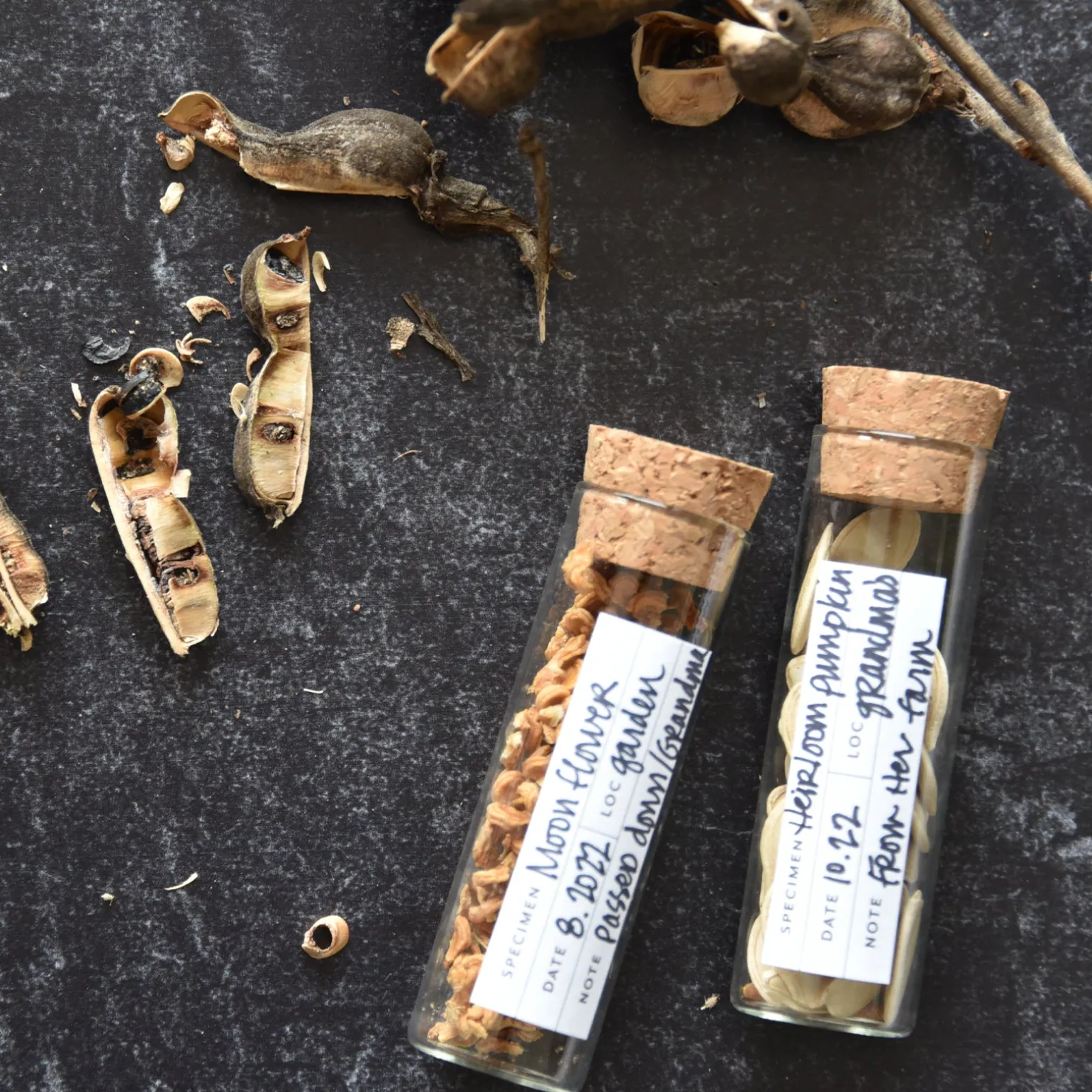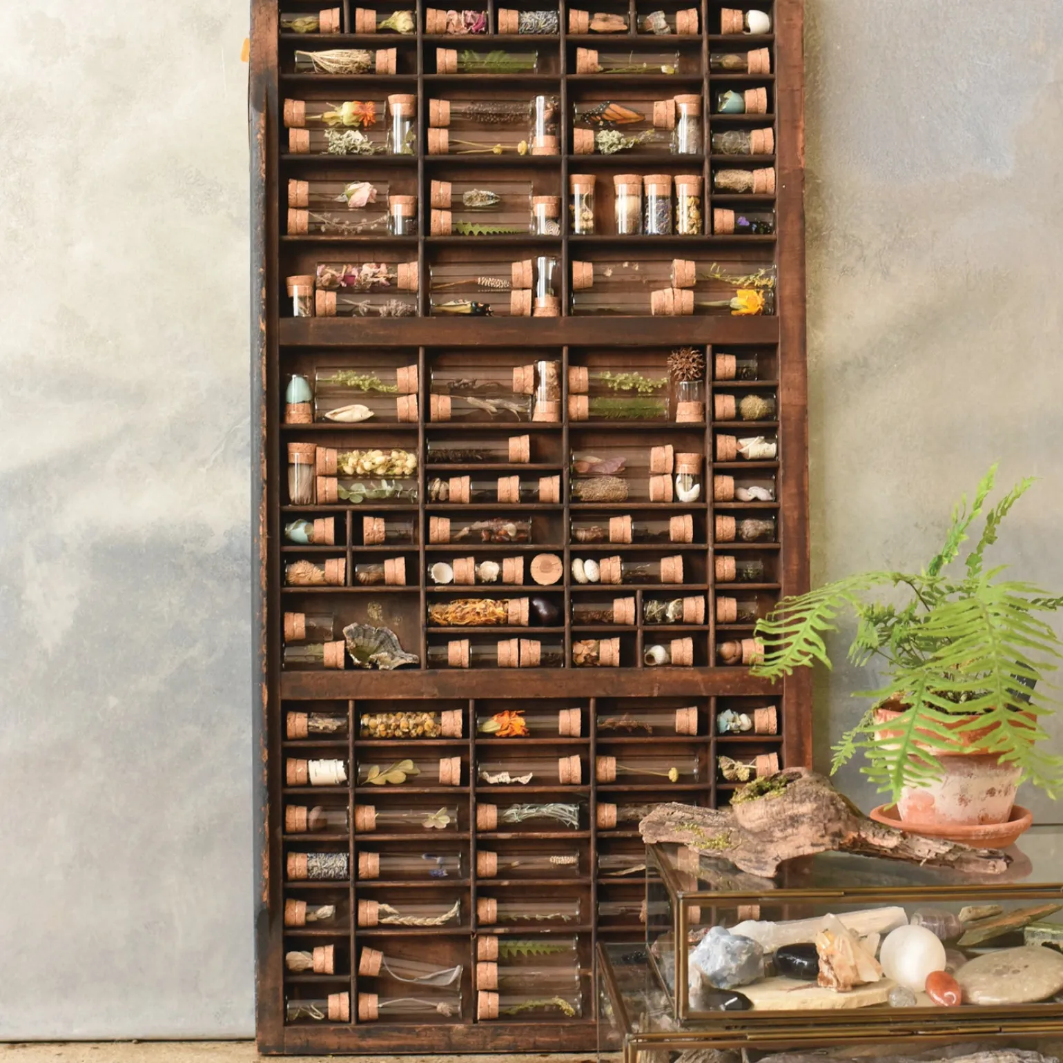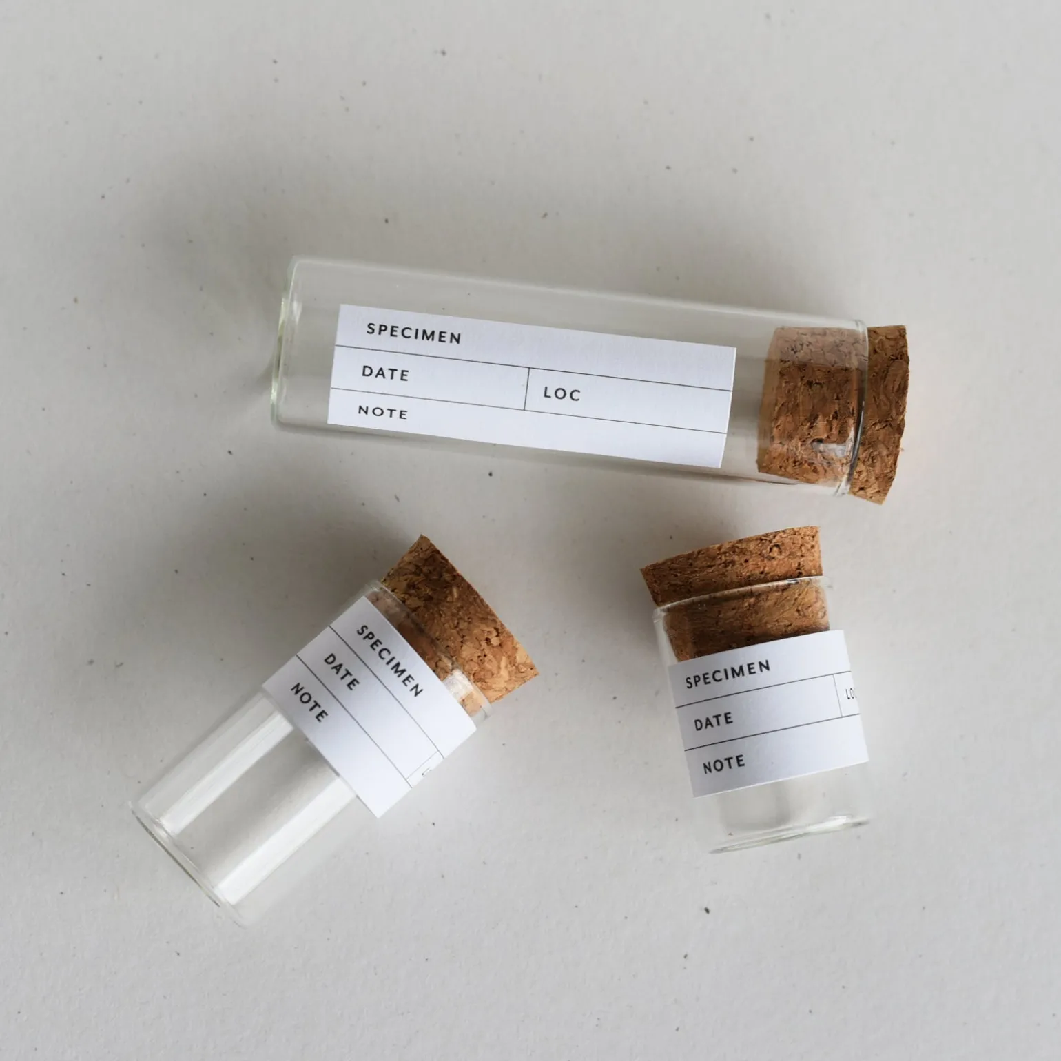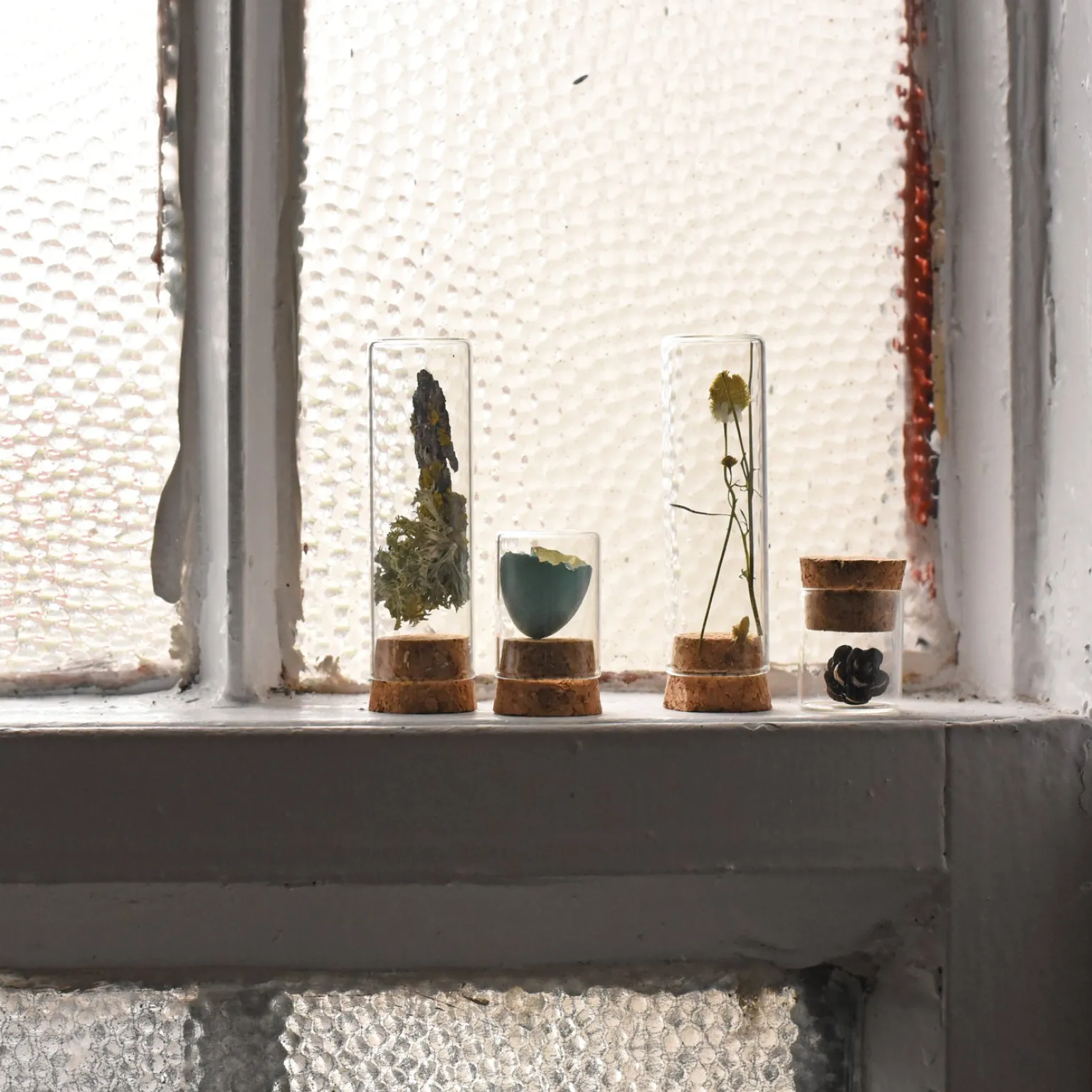 These small glass display bottles are perfect for expanding your collection and pair with our Collecting Kits. Use for encapsulating tiny finds like a snippet of moss, an herb sprig, or dandelion wishes to name a few. Flat bottom allows them to stand on cork or glass bottom when displaying. Choose your size when adding to the cart.