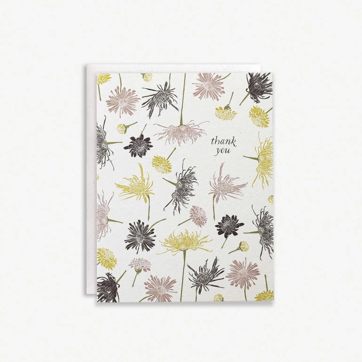 Chrysanthemums symbolize friendship, love, optimism, joy, and happiness; what better way to say thank you! Printed on 110lb natural white, slightly speckled recycled paper, and paired with a matching cream envelope. Blank Inside.