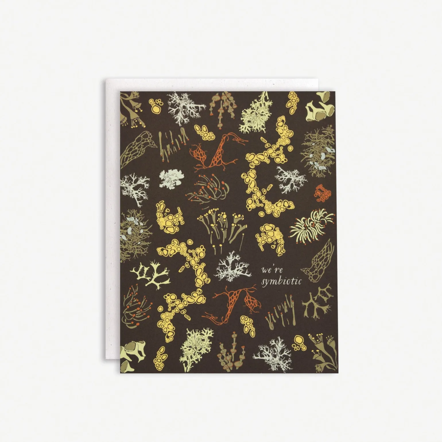 Symbiotic the way alga and fungi make up Lichen. Printed on 110lb natural white, slightly speckled recycled paper, and paired with a matching cream envelope. Blank Inside.