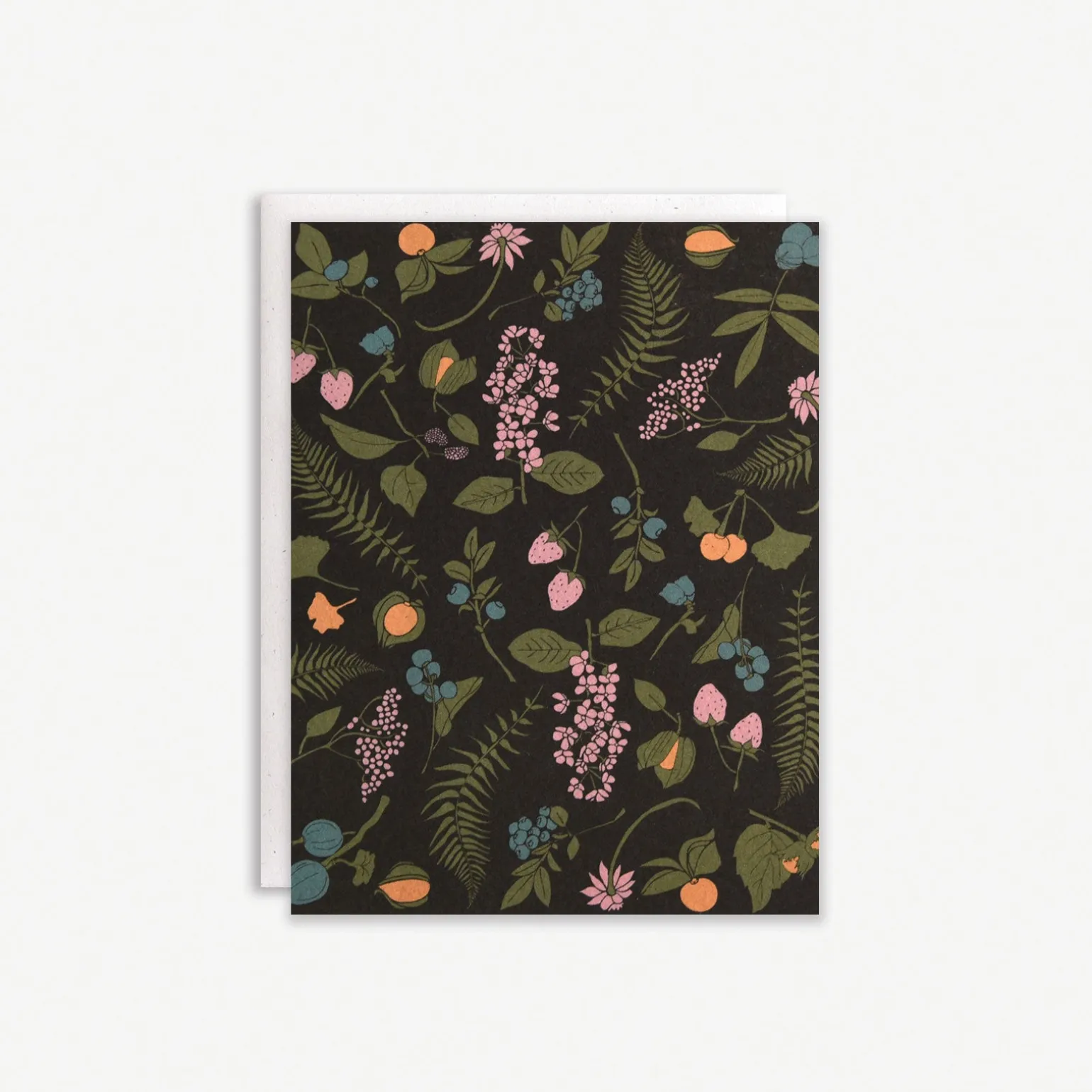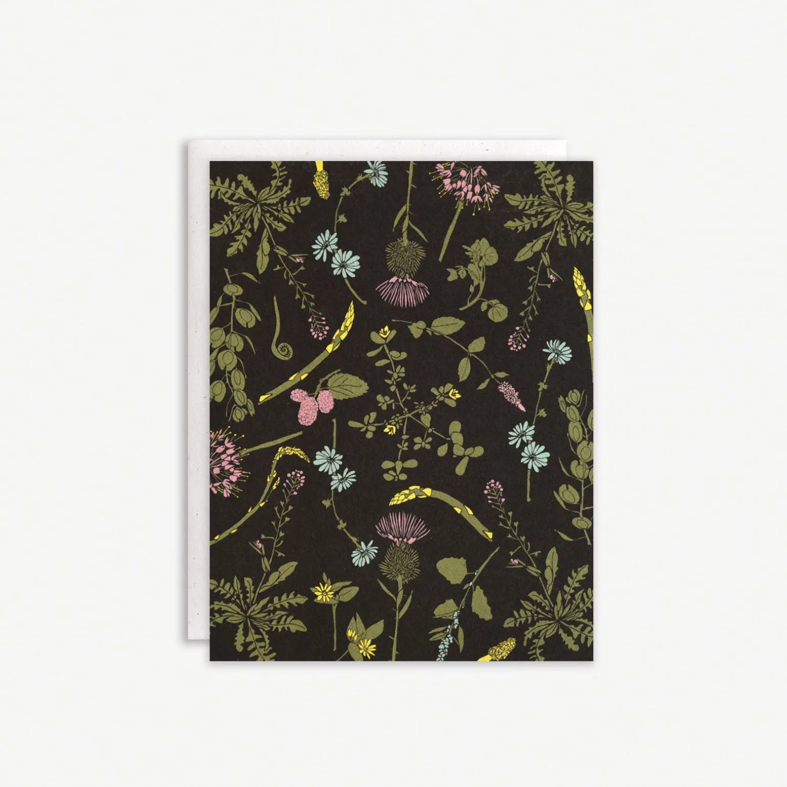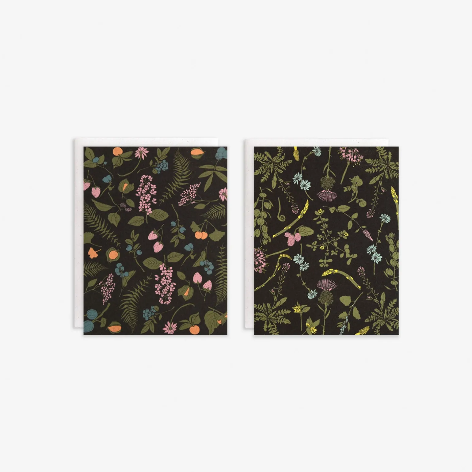 Fiddleheads, wild berries, morels, nuts and wild asparagus adorn these patterned cards of edible wilds. These cards are printed on 110lb natural white, slightly speckled recycled paper, and paired with matching cream envelopes. All cards are blank inside.