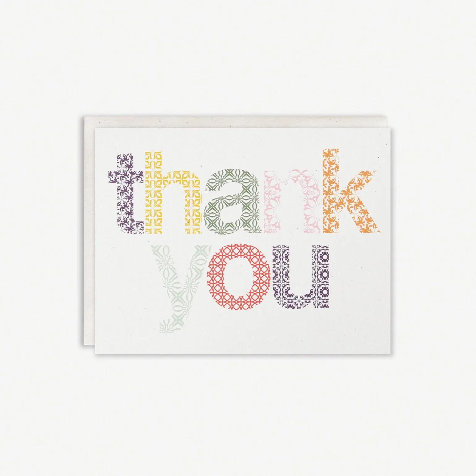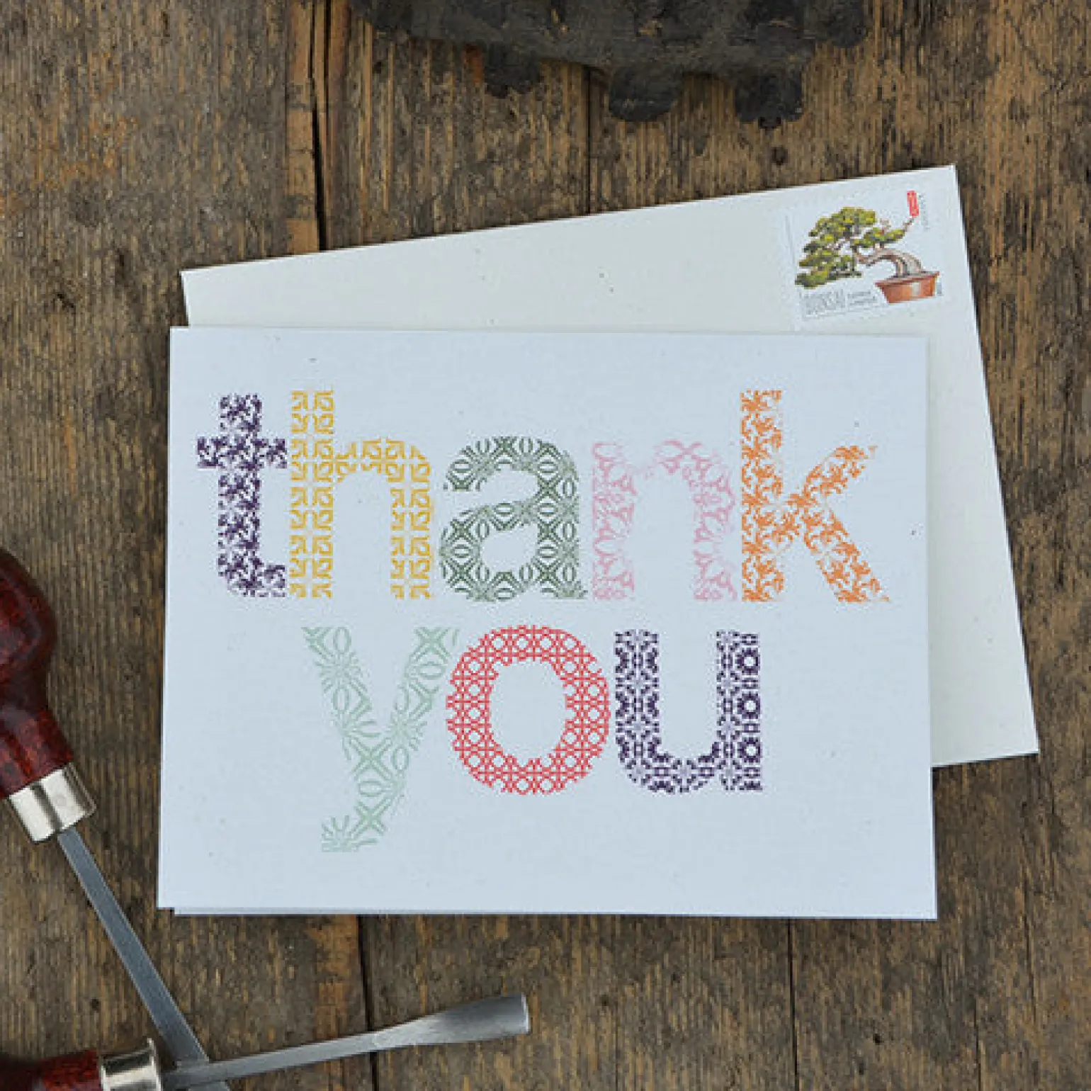 Our Woodblock Thank You card is printed on 110lb natural white, slightly speckled recycled paper, and paired with a matching cream envelope. Blank Inside.