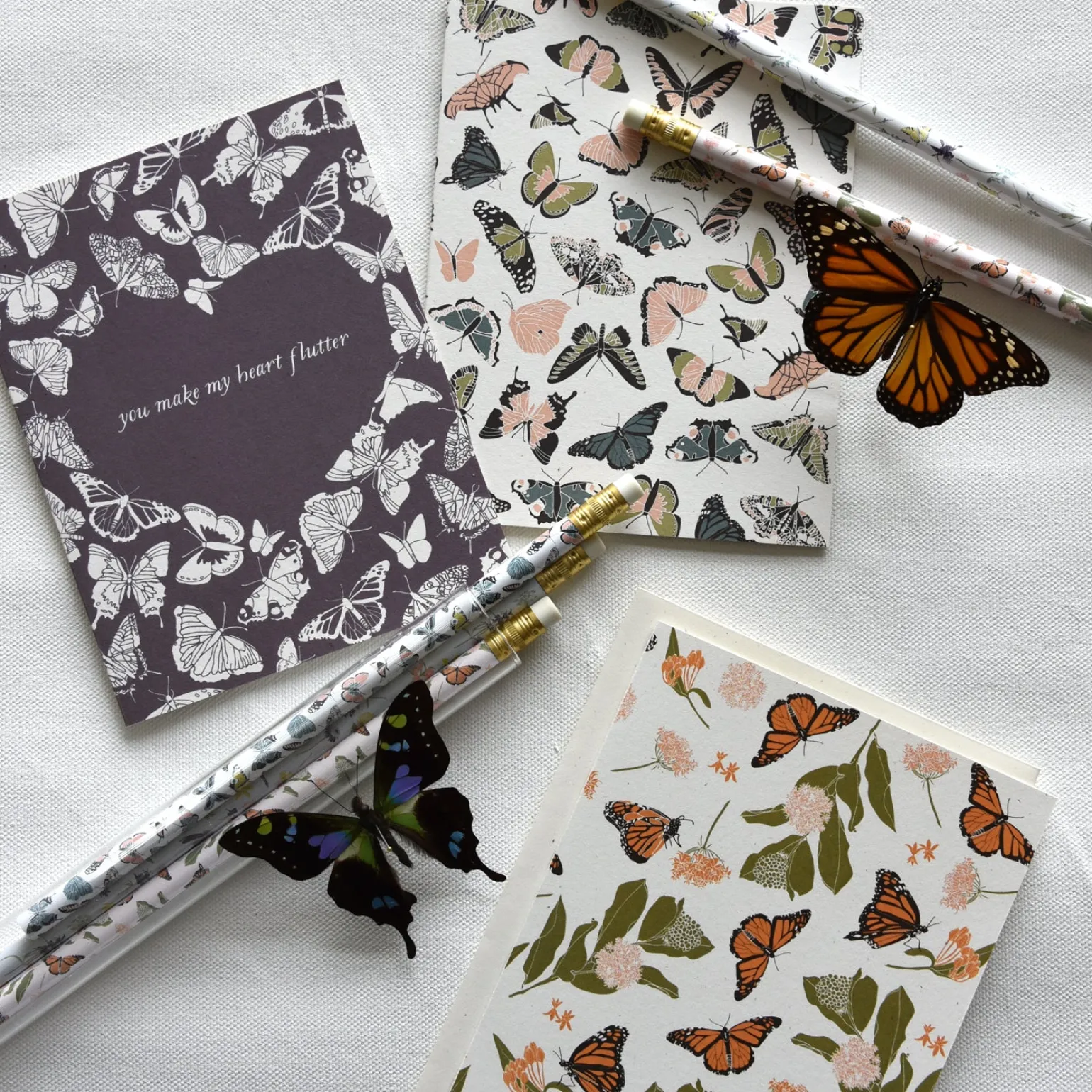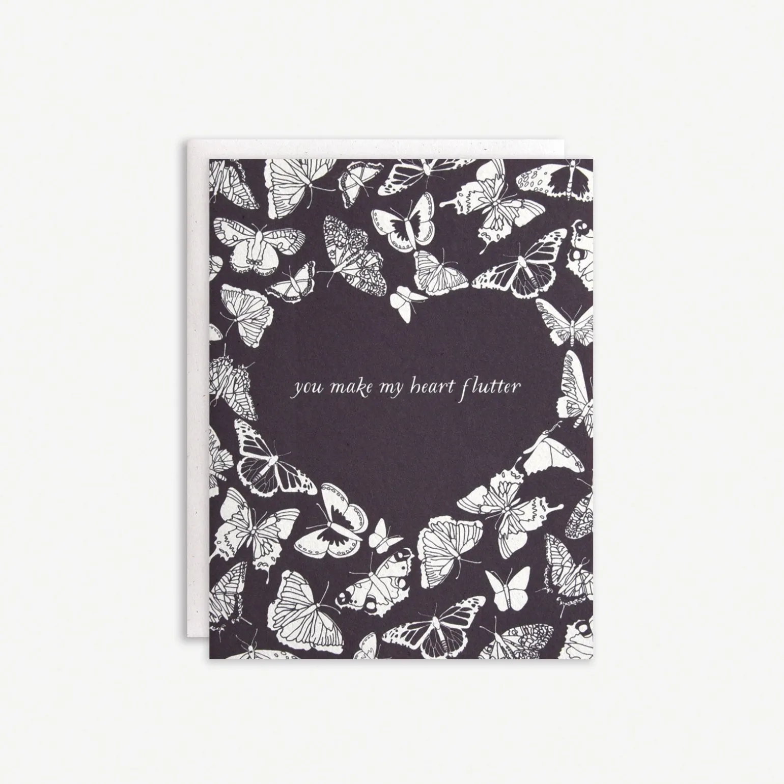 Fluttery heartbeats are some of the best kind (figuratively speaking). Printed on 110lb natural white, slightly speckled recycled paper, and paired with a matching cream envelope. Blank Inside.